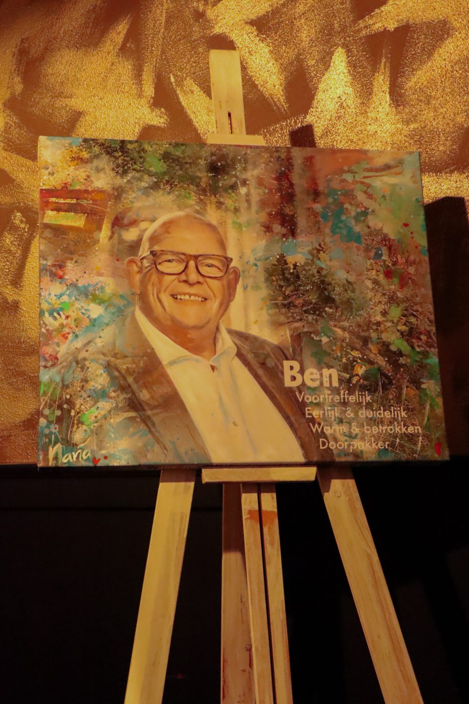 Na de prachtige en emotionele speech van onze burgemeester werd door kunstenares Nanna Marion van der Horst een schilderij onthuld en overhandigd als aandenken aan de aftredende wethouder. Zichtbaar geëmotioneerd door de mooie woorden en het cadeau kreeg Ben Brands vervolgens het woord. Kort maar krachtig bedankte hij iedereen voor de fijne tijd als wethouder van Boekel. Onder luid applaus verliet hij het podium om weer plaats te nemen bij zijn familie.