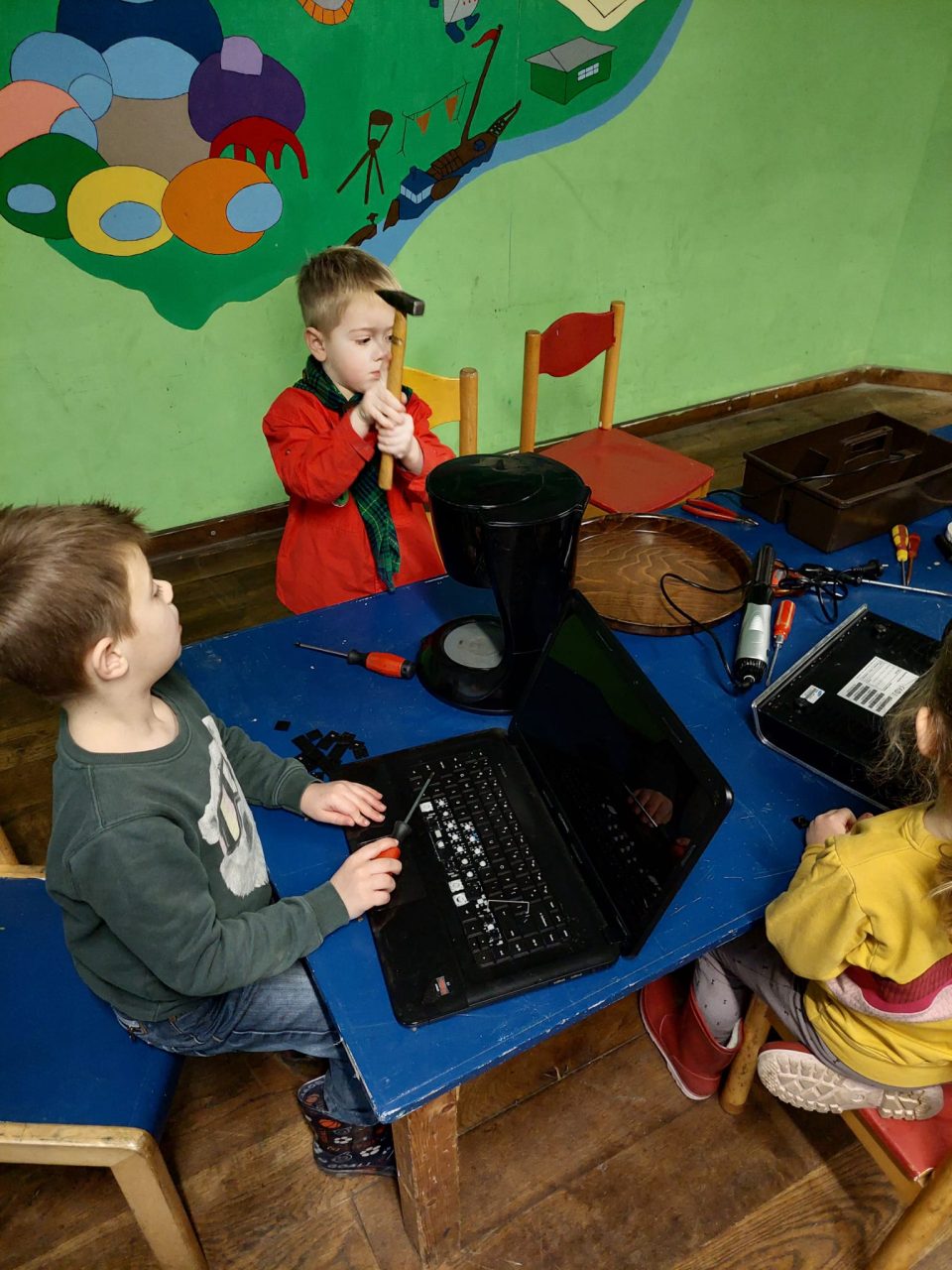 Er waren diverse defecte of afgedankte apparaten verzameld, zoals een laptop, koffiezetapparaat en radio. Deze werden meegenomen naar de blokhut, waar de leiding gezorgd had voor gereedschap en begeleiding. In eerste instantie werd met beleid gewerkt: schroefje voor schroefje werden de apparaten gedemonteerd. Maar dat duurde wel lang, dus al snel werd er gekozen voor een directere aanpak. Met een hamer bleken de apparaten ook prima uit elkaar te halen! Wat opviel, was hoeveel onderdelen zo’n apparaat eigenlijk bevat.