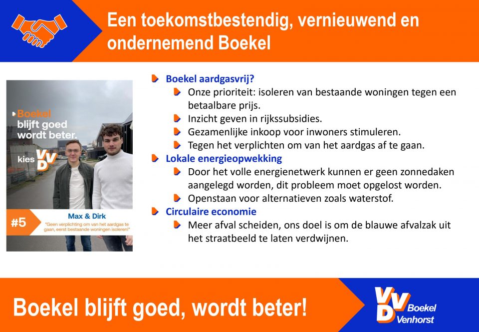 De transitievisie warmte, een eerste stap op weg naar een (mogelijk) aardgasvrij Boekel, vraagt een mega investering die veel inwoners zorgen baart met de vraag hoe dit te betalen. Wij maken ons serieus zorgen over het ontstaan van energiearmoede. Vooral ook door het capaciteitsprobleem van ons elektriciteitsnetwerk vraagt regionaal en provinciaal onze aandacht.