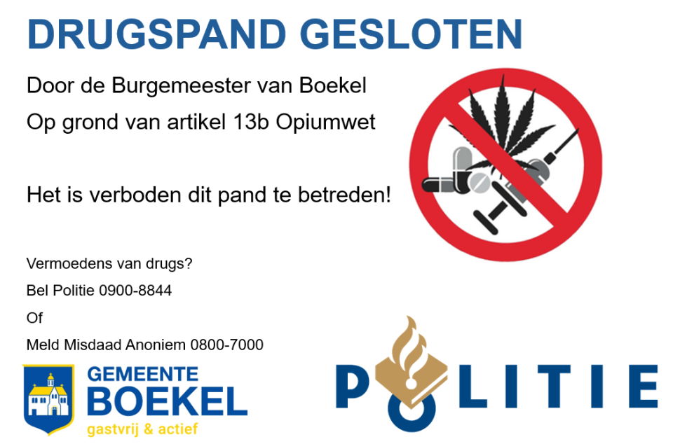 Drugs gaan vaak samen met overlast en criminaliteit. Samen met de politie zet de gemeente Boekel zich in om dit aan te pakken en onze gemeente veilig te houden. Daarbij is de hulp van inwoners van groot belang. Ervaart u drugsoverlast of heeft u een vermoeden van druggerelateerde criminaliteit? Neem dan contact op met de politie via telefoonnummer 0900-8844. Wilt u dit liever anoniem doen? Neem dan contact op met Meld Misdaad Anoniem via 0800-7000. Zij zetten uw melding door naar politie en/of onze gemeente. U kunt ook zelf de gemeente benaderen via meldpunt ondermijning. Neem dan contact op via info@boekel.nl of via telefoonnummer 0492-326800.