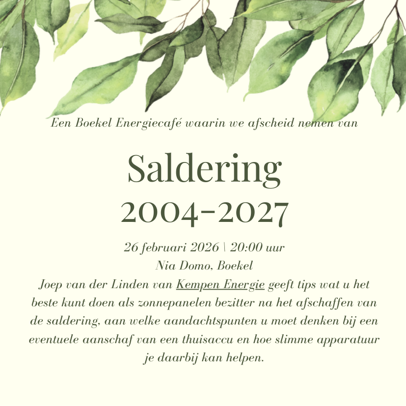De organisatie van Boekel Energie begint het nieuwe jaar goed met een energiecafé in Nia Domo op donderdag 26 februari om 20.00 uur. Het energiecafé staat deze keer in het teken van de afschaffing van de saldering in 2027 voor de eigenaren van zonnepanelen.