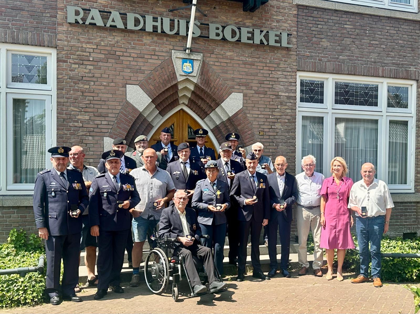 Burgemeester-Caroline-van-den-Elsen-en-veteranen-uit-de-gemeente-Boekel-poseren-samen-voor-het-Raadhuis