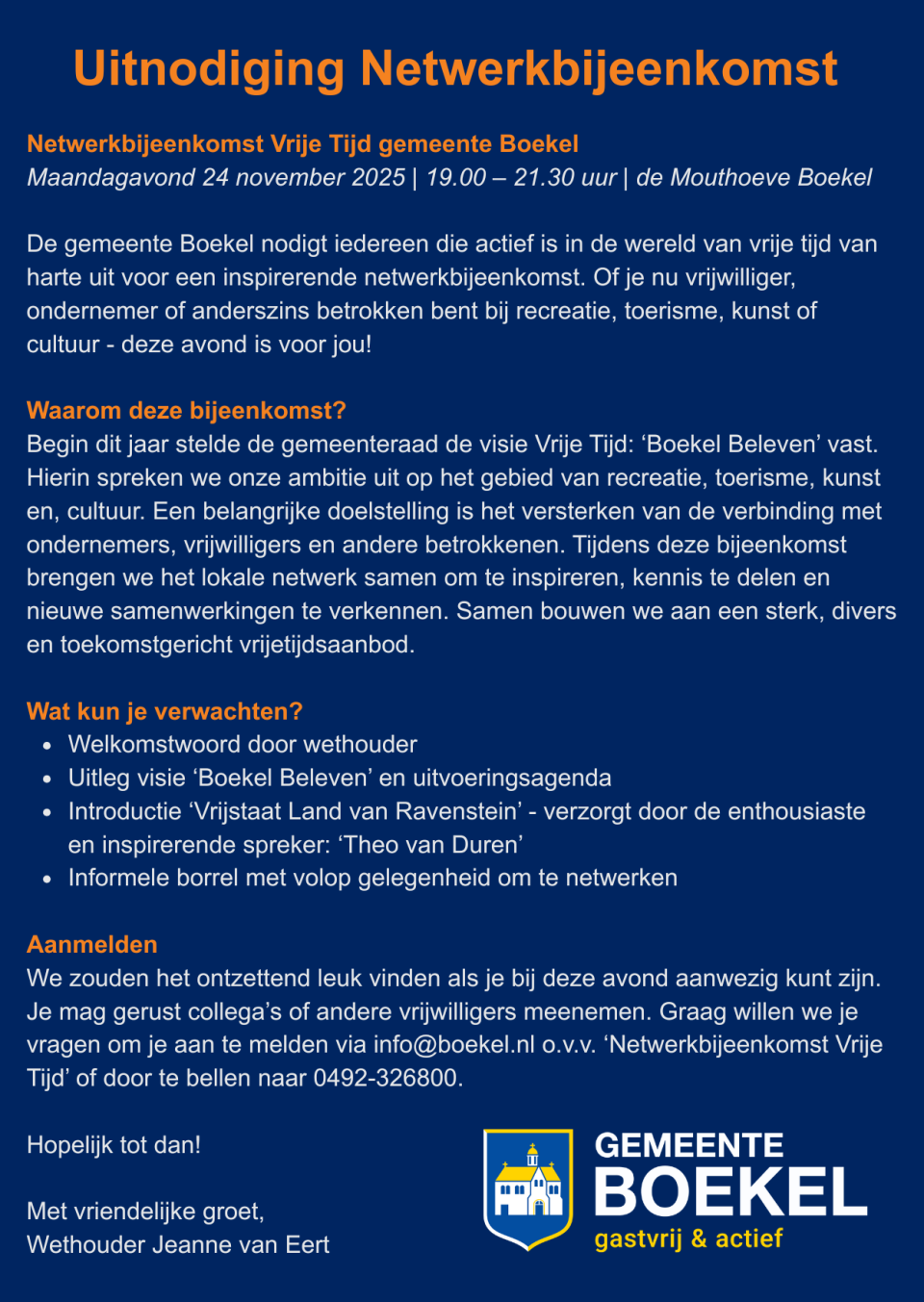 Aanmelden: stefanie.vanalphen@boekel.nl