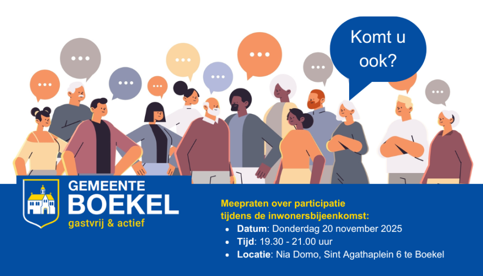 De gemeente Boekel maakt een nieuw participatieplan. Dit plan beschrijft hoe inwoners, ondernemers en anderen kunnen meedenken en meedoen bij gemeentelijke plannen en besluiten. Bijvoorbeeld bij het opnieuw inrichten van een weg of natuur en recreatie.