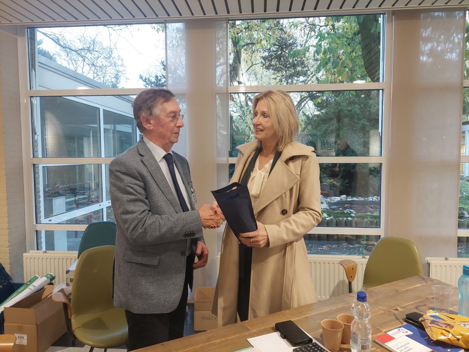 Op de verkiezingsdag, 29 oktober jl., heeft burgemeester Caroline van den Elsen Laurens Manders in het zonnetje gezet bij het stembureau in Huize Padua. Laurens is al maar liefst 60 jaar actief op het stembureau — een uitzonderlijke prestatie.
