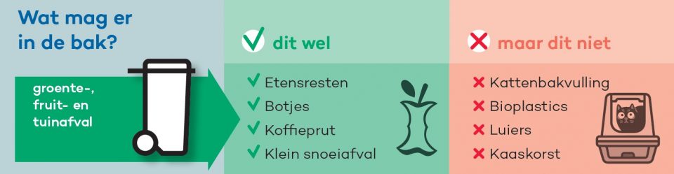 - Laat het natte groente- en fruitafval, theezakjes en koffiefilters uitlekken voordat u het in uw GFT-e container doet. Hoe minder water er in zit, hoe minder kans op bevriezing.