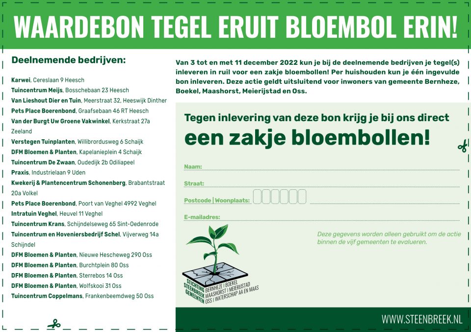 Kijk eens goed rond in uw eigen tuin. Zijn al die stenen en tegels wel echt nodig? Wilt u meehelpen om gemeente Boekel groener te maken? Dan heeft u nu de kans om een eerste stap te zetten. Lever tussen 3 t/m 11 december 2022 een tegel in en u krijgt van ons een gratis zakje bloembollen.
