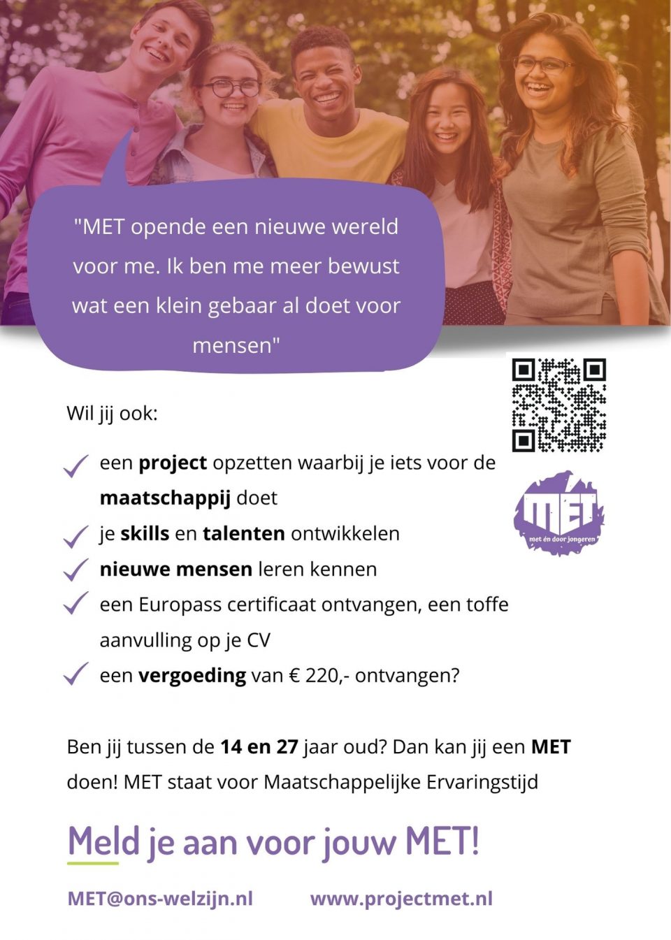 Wij zijn opzoek naar jou! Lijkt het jou leuk om voor de Gemeente Boekel iets te betekenen doormiddel van het MET-project. MET staat voor Maatschappelijke Ervaringstijd en is onderdeel van het Actieprogramma Maatschappelijke Diensttijd. Ontwikkel je talenten en skills door MET.