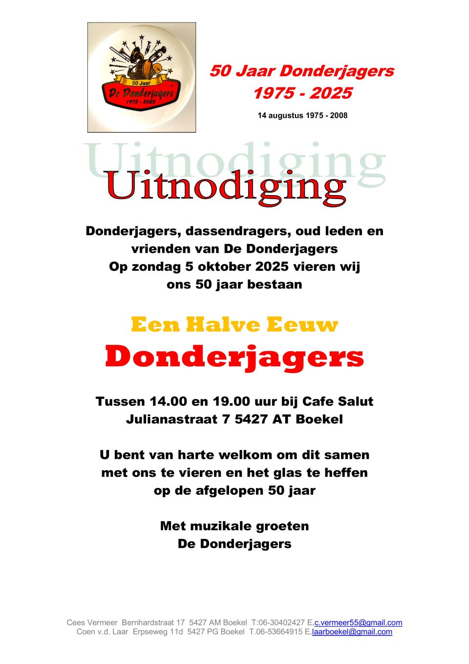 Dit alles samengevat willen zij daarom vieren op 5 oktober bij café Salut (tussen 14.00 en 19.00 uur)! Een feestelijke HALVE EEUW DONDERJAGERS met als stralend middelpunt Henk en Toon, die vanaf de oprichting zeer gewaardeerde, trouwe leden zijn.