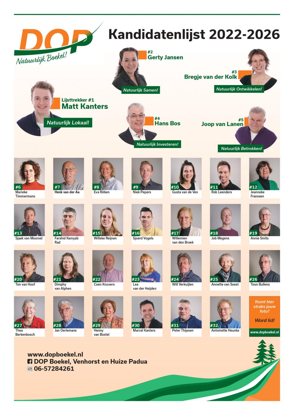 De DOP heeft grote ambities voor de komende gemeenteraadsverkiezingen. Een groenere en socialere gemeente Boekel waarbij beter wordt geluisterd naar de inwoners. En we hebben de wind in de rug. Met trots kunnen we zeggen dat we de grootste lijst zijn. Wij presenteren voor deze verkiezingen namelijk maar liefst 32 kandidaten die een afspiegeling zijn van gemeente Boekel.