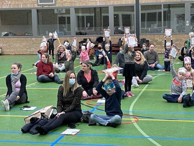 Na afloop van de speurtocht kwam het officiële moment, de uitreiking van het letterdiploma. De kinderen mochten op een verhoging gaan staan en onder luid applaus van alle aanwezigen hun letterdiploma in ontvangst nemen. Tot slot nog een letterkoekje en voldaan naar huis. Wat een mooi feestje en we zijn blij dat ondanks alle regels het letterfeest gewoon door kon gaan. En voor de kinderen die thuis in quarantaine zaten, was er een thuisfeestpakket bezorgd en natuurlijk hun letterdiploma.