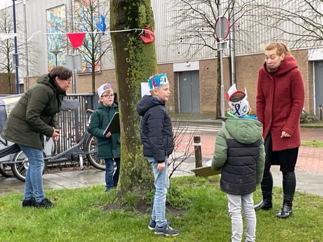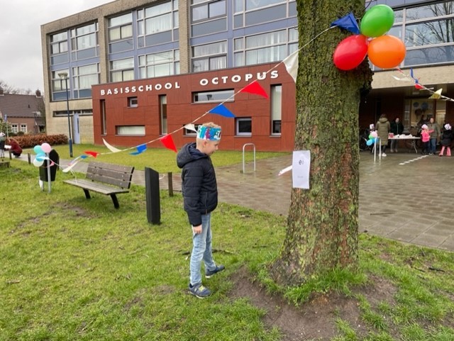 Voor de kinderen was het één grote verrassing wat er op het programma stond. In de klas speelden we een letterbingo. Daarna mochten ze de jas aan gaan doen voor een letterspeurtocht rondom ons kindcentrum, gelukkig was het net droog. Wat ze niet wisten was, dat er van ieder kind één ouder, opa of oma aanwezig was om met hen de letterspeurtocht te lopen. Zo mooi, die verbaasde blikken toen ze buiten kwamen en zagen wie er was. Enkele ouders hadden slingers en ballonnen opgehangen voor een feestelijk tintje en juf Corrie was zo aardig geweest om voor iets lekkers te zorgen voor iedereen, waarvoor onze dank.