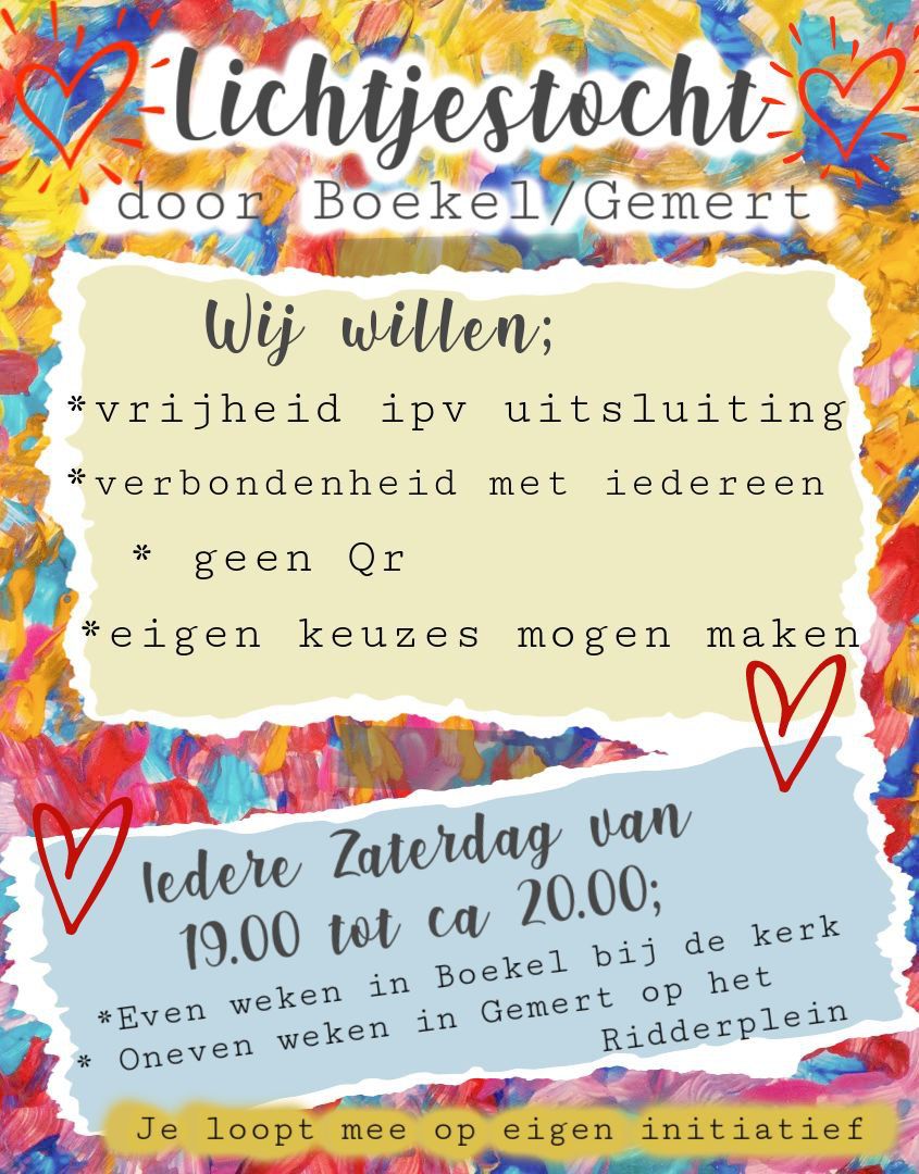 Rond de klok van 19 uur trok, op zaterdag 29 januari, een groep van enkele tientallen inwoners uit Boekel lopend met lichtjes door het centrum van Boekel onder het mom ‘Wij strijden voor vrijheid van alle Nederlanders’.