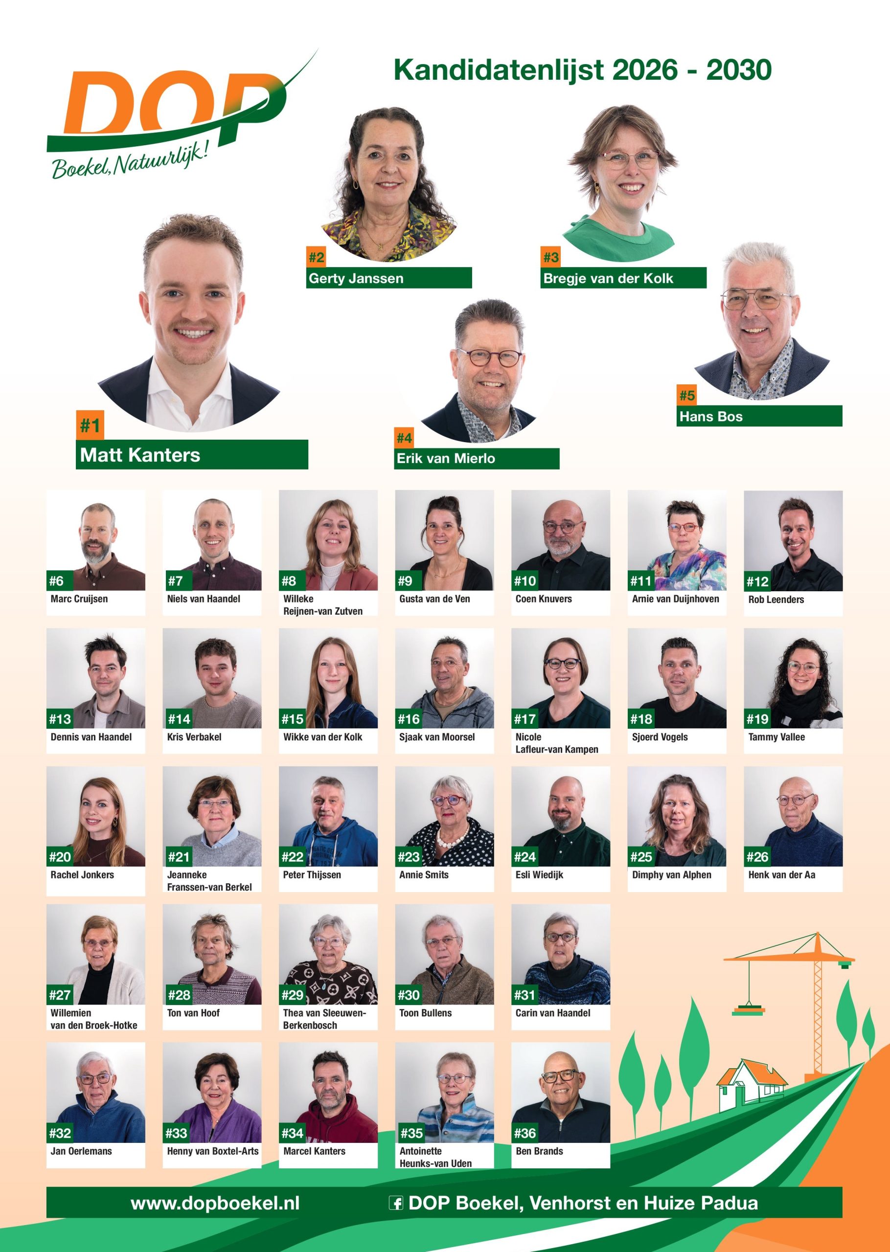 De kandidatenlijst van de grootste partij in de gemeente Boekel, DOP, is officieel bekendgemaakt. De lijst telt 36 kandidaten en weerspiegelt een brede vertegenwoordiging van de Boekelse samenleving, met mensen uit alle hoeken van de gemeente.