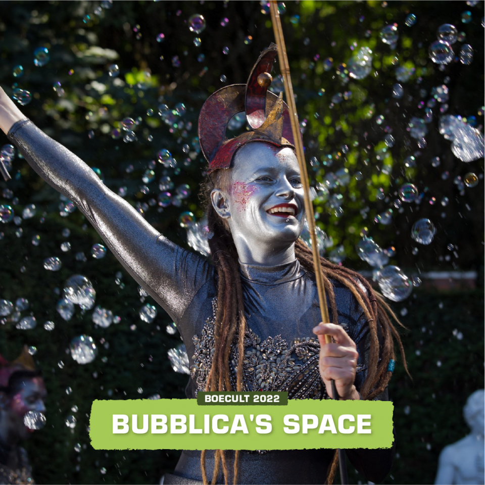 Het park achter Nia Domo is traditioneel bestemd voor de straatartiesten. Eén daarvan is Bubblica. Tijd krijgt een ander perspectief, ruimte wordt op speelse wijze bespeeld, even lijkt de wereld alleen maar te bestaan uit de ongrijpbare schoonheid van de zeepbellen. Bubblica’s mobiele zeepbellen brengen BoeCult tot leven. Een fraai stukje straattheate. Bubblica brengt de fantasie op hol. Laat je betoveren door de ongrijpbare realiteit van dit tijdloze spektakel!
