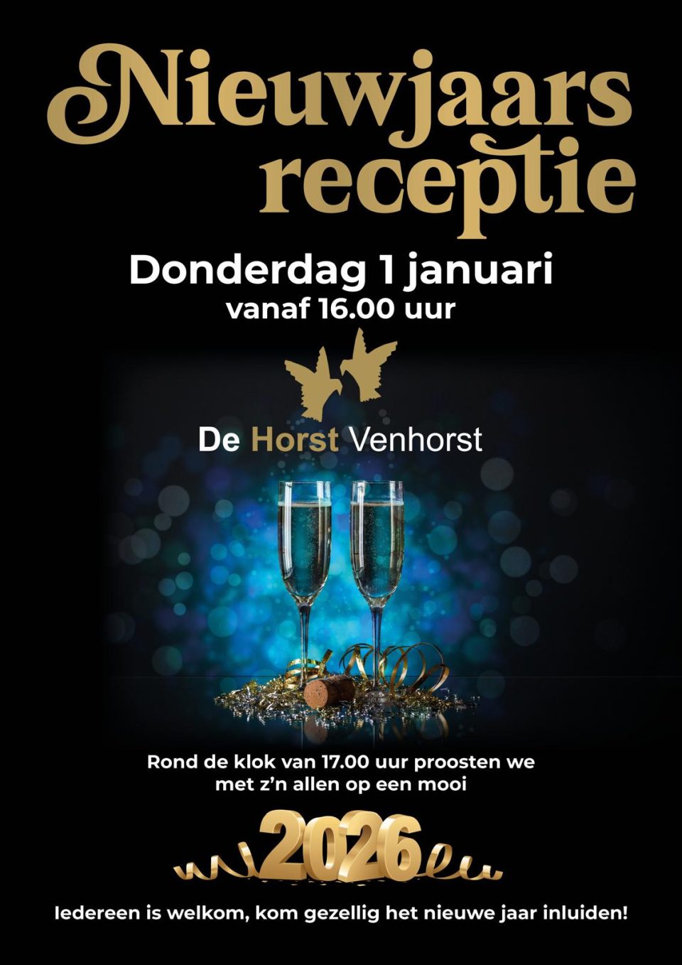 Op donderdag 1 januari is er een nieuwjaarsreceptie in De Horst in Venhorst. Om 16.00 uur start de receptie en rond de klok van 17.00 uur wordt er geproost op een mooi 2026.