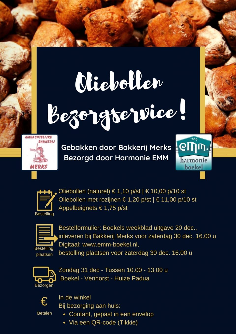 Net als voorgaande jaren heeft Harmonie EMM Boekel dit jaar ook weer de oliebollenbezorgservice in samenwerking met Ambachtelijke Bakkerij Merks!
