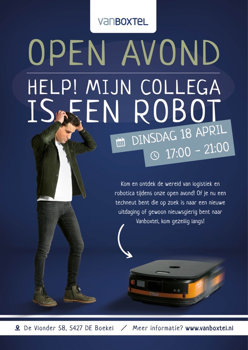 Nieuwsgierig naar Vanboxtel? Kom dan op 18 april 2023 van 17:00-21:00 de wereld van logistiek en robotica ontdekken tijdens onze open avond! Of je nu een techneut bent die op zoek is naar een nieuwe uitdaging of gewoon nieuwsgierig bent naar Vanboxtel, kom gezellig bij ons langs.