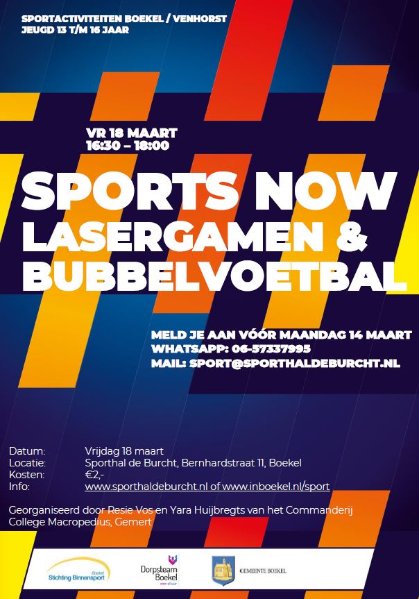 Wij zijn Resie Vos en Yara Huijbregts uit Boekel en gaan voor schoolopdracht een sportmiddag organiseren. Daarom leek het ons leuk om te gaan Bubbelvoetballen en Lasergamen. De bedoeling is dat je alles minimaal 2x speelt. In zaal A gaan wij Lasergamen en in zaal B gaan we bubbelvoetbal spelen.