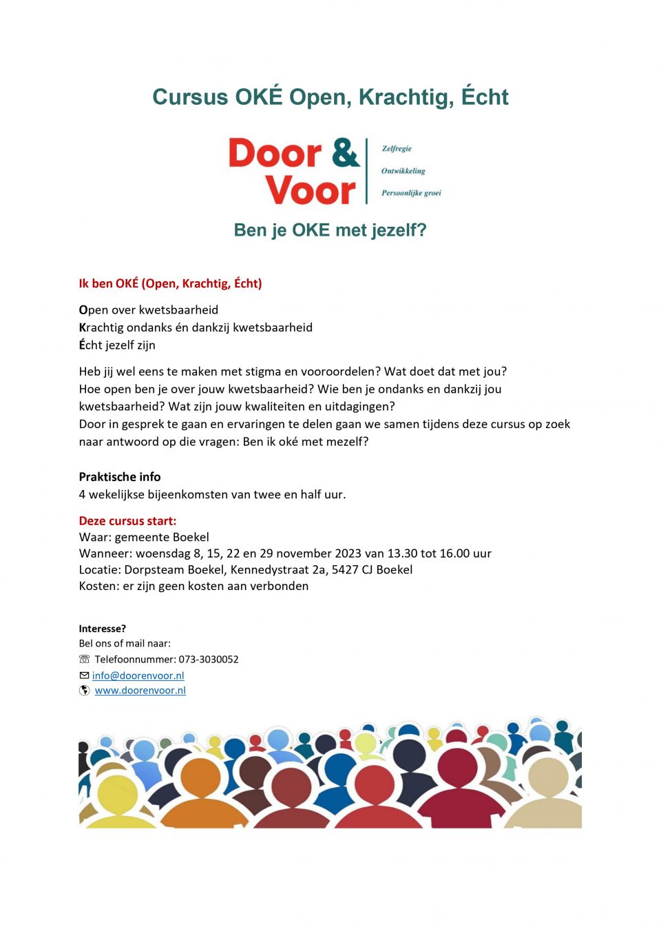 Op vrijdag 8 november start er een kosteloze cursus ‘Ben je OKE met jezelf?’. in de ruimte van het Dorpsteam in Boekel. De cursus gaat over: Open over kwetsbaarheid, Krachtig ondanks en dankzij kwetsbaarheid en Echt jezelf zijn!