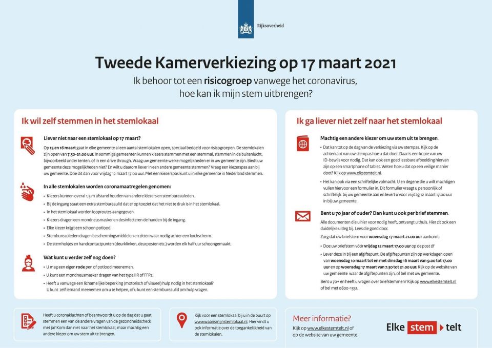 Behoor je tot de risicogroep door het coronavirus en wil je zelf stemmen in het stemlokaal bij de Tweede Kamerverkiezing? Op 15 en 16 maart kun je dan van 7.30 uur tot 21.00 uur terecht in het gemeentehuis in Boekel.