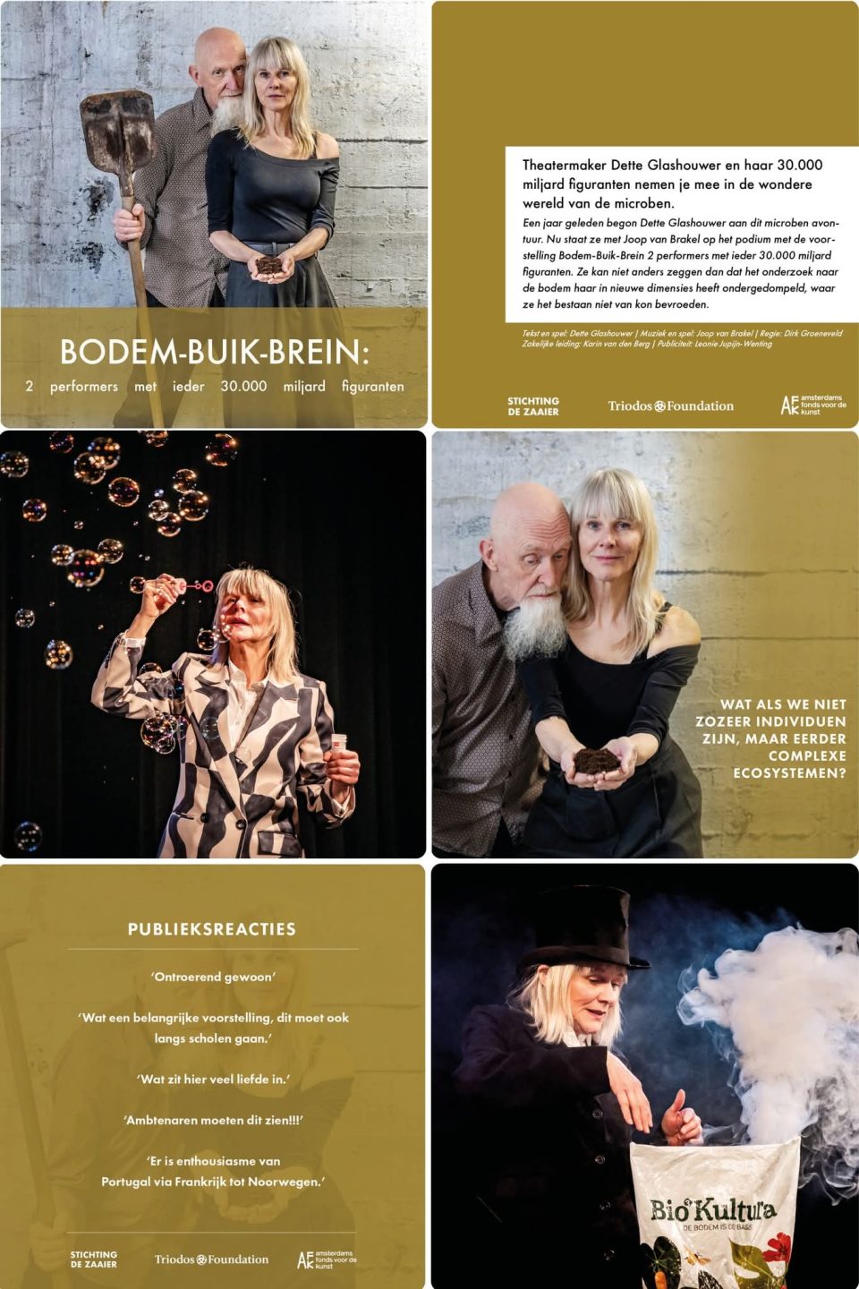 Waar Dette Glashouwer een jaar geleden haar microbenavontuur begon, tilt zij nu het publiek samen met Joop van Brakel naar een nieuwe dimensie. In Bodem-Buik-Brein wordt het onderzoek naar de bodem en het microleven daarin op een verrassende en indringende manier vertaald naar het podium. De voorstelling laat zien hoe nauw ons bestaan verweven is met de kleinste levensvormen om ons heen.