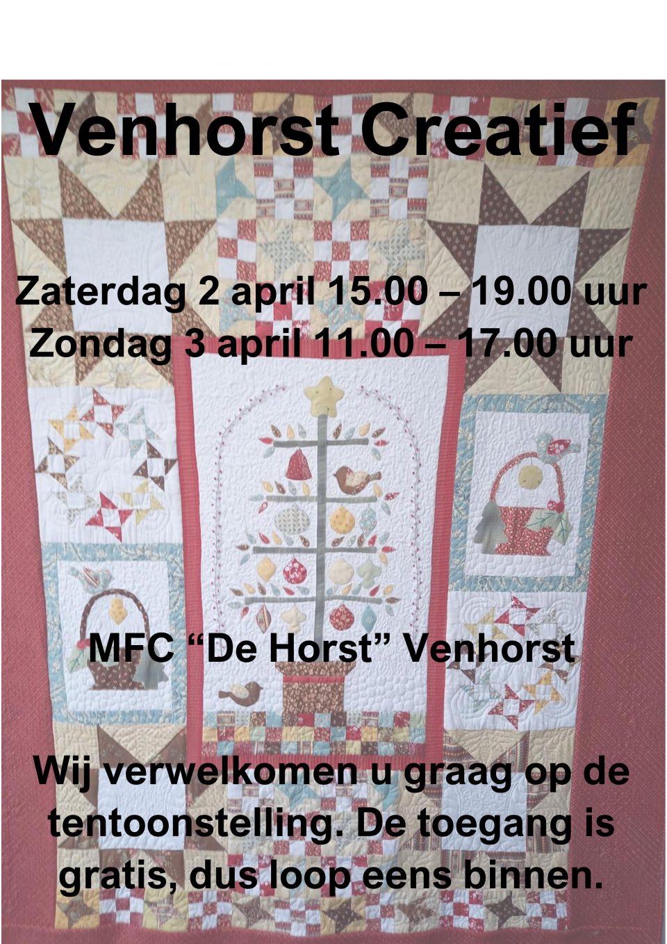Dit jaar is het ruim 45 jaar geleden dat Venhorst Creatief door vrijwilligers is opgericht. Er werd een tentoonstelling georganiseerd met werkstukken die de inwoners van Venhorst gemaakt hadden. Zo vindt ook dit jaar weer een tentoonstelling plaats. Diverse deelnemers hebben zich opgegeven en laten hun werk van het afgelopen jaren graag zien.